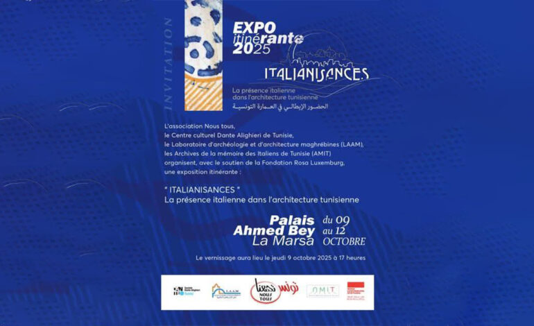 Le Palais Ahmed Bey à La Marsa, fraîchement restauré et classé monument historique depuis 2016, ouvre ses portes du 9 au 12 octobre 2025 à l’exposition itinérante et pédagogique «Italianisances: la présence italienne dans l’architecture tunisienne». Après son escale inaugurale à La Marsa, l’événement se déplacera à l’École nationale d’architecture et d’urbanisme de Tunis (13-19 octobre), puis à la galerie El Teatro à Tunis (21-31 octobre).