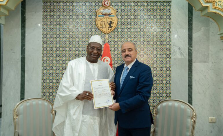Le ministre des Affaires étrangères, de la Migration et des Tunisiens à l’étranger, Mohamed Ali Nafti, a reçu, ce lundi 3 novembre 2025, au siège du ministère, Abdourahmane Sikhé Camara, nouvel ambassadeur de la République de Guinée auprès de la République tunisienne, résidant à Alger, qui lui a remis une copie figurée de ses Lettres de Créance.Au début de la rencontre, le ministre a salué les relations fraternelles et de coopération solides qui unissent la Tunisie et la Guinée, rappelant que les deux pays célèbrent cette année le 66ᵉ anniversaire de l’établissement de leurs relations diplomatiques.Dans ce cadre, Nafti a souligné l’importance de renforcer davantage les liens bilatéraux, en valorisant les opportunités de coopération dans les domaines de la santé, de l’enseignement supérieur et de la formation professionnelle.Le ministre a également mis en avant la dynamique économique entre les deux pays, illustrée par les échanges de visites d’hommes d’affaires cherchant à explorer de nouvelles pistes de coopération et d’investissement. Il a, en outre, appelé à une meilleure coordination entre la Tunisie et la Guinée au sein de l’Union africaine et de ses structures spécialisées, afin de consolider l’action africaine commune.Pour sa part, l’ambassadeur Abdourahmane Sikhé Camara a exprimé sa volonté de renforcer davantage la coopération bilatérale, tout en adressant la reconnaissance de son pays à la Tunisie pour l’assistance technique fournie dans la formation de cadres guinéens dans plusieurs secteurs. Il a salué le niveau de compétence des experts tunisiens actifs en Guinée, notamment dans les domaines de la formation professionnelle, des infrastructures, de la santé et des bureaux d’études.En conclusion, le ministre Mohamed Ali Nafti a réaffirmé la disponibilité du ministère et de l’ensemble des institutions tunisiennes concernées à offrir à l’ambassadeur tout le soutien et les facilités nécessaires à l’accomplissement de sa mission diplomatique dans les meilleures conditions.