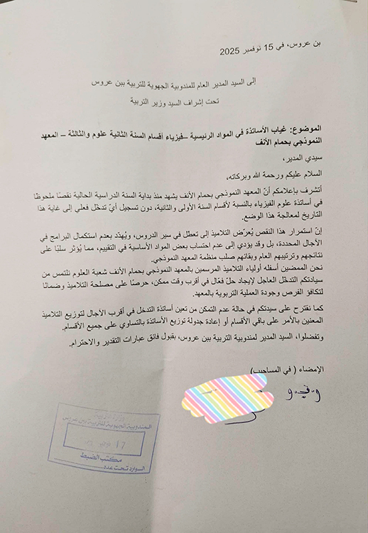Excédés, les parents ont fini par envoyer une pétition, le mois de novembre dernier, au Commissariat Régional de l’Éducation de Ben Arous, obtenant la promesse qu’un professeur de sciences physiques sera bientôt affecté. L’attente se prolonge, et le compte à rebours avant la période d’examen s’accélère, laissant les élèves dans une situation d’incertitude pédagogique et administrative inacceptable.