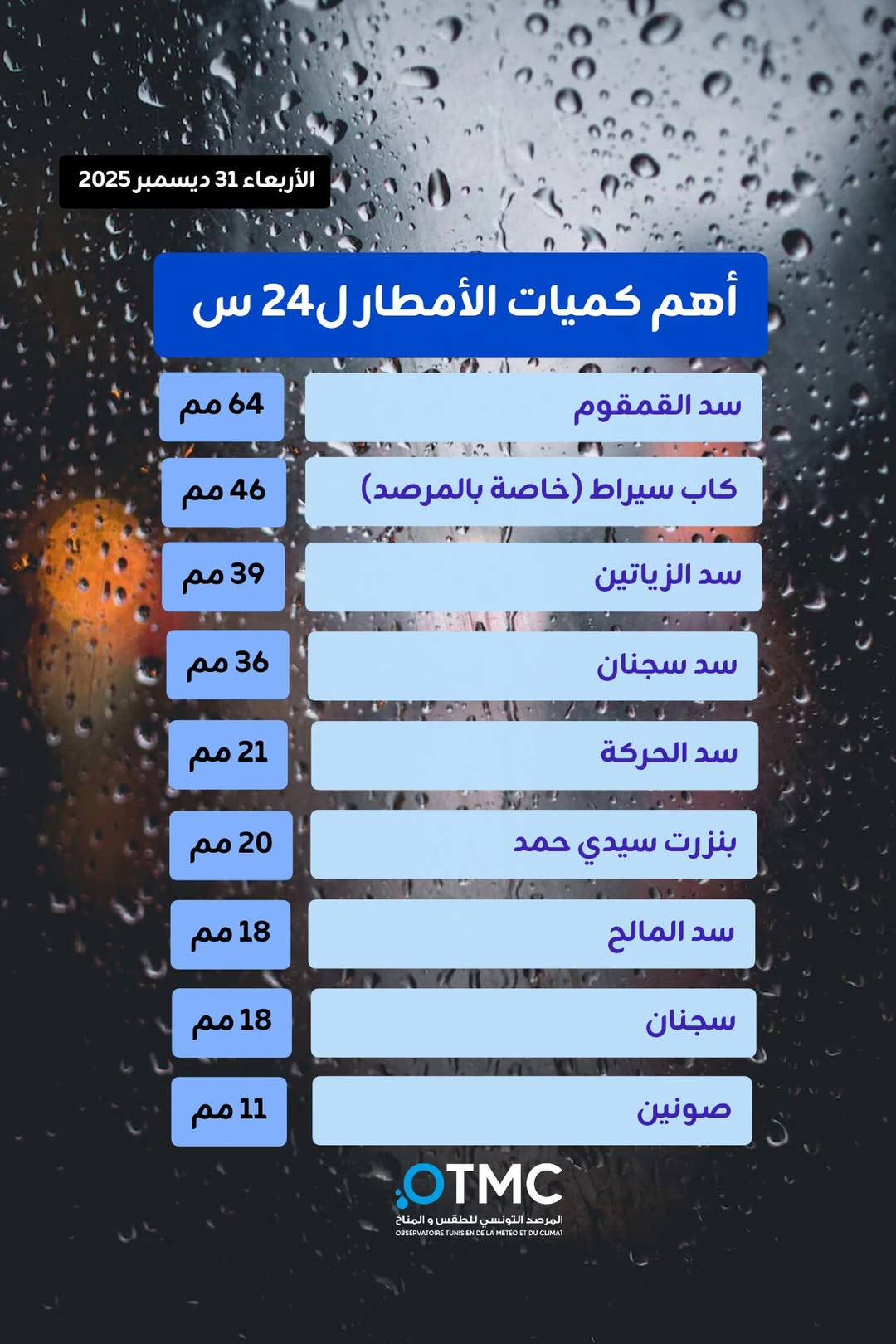 L’Observatoire tunisien de la météo et du climat (OTMC) a publié ce mercredi 31 décembre 2025 les relevés des précipitations sur 24 heures dans plusieurs régions du pays, révélant des quantités remarquables, en particulier dans le nord et le centre.