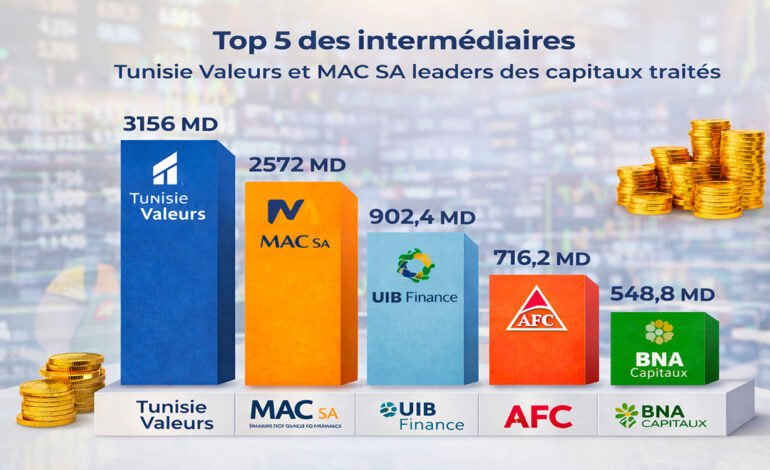 UIB Finance arrive en troisième position avec un volume global traité de 902,4 MD et une part de marché de 8,39%, suivi par AFC (716,2 MD et une part de marché de 6,66%) et BNA Capitaux (548,8 MD et une part de marché de 5,1%).