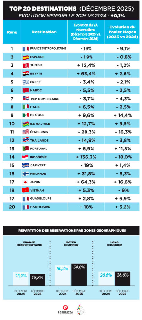 Le Top 20 des destinations en décembre 2025 montre des évolutions contrastées dans l’appétence des Français pour certaines zones touristiques. Sur l’ensemble des destinations, la croissance moyenne mensuelle s’établit à +0,1 %. Les plus fortes progressions sont observées notamment pour l’Égypte (+63,4 %), l’île Maurice (+12,7 %) et la Tunisie (+12,4 %), tandis que certaines destinations européennes comme la France métropolitaine (-19 %), l’Espagne (-1,9 %) ou la Grèce (-3,4 %) subissent une baisse de leurs réservations.