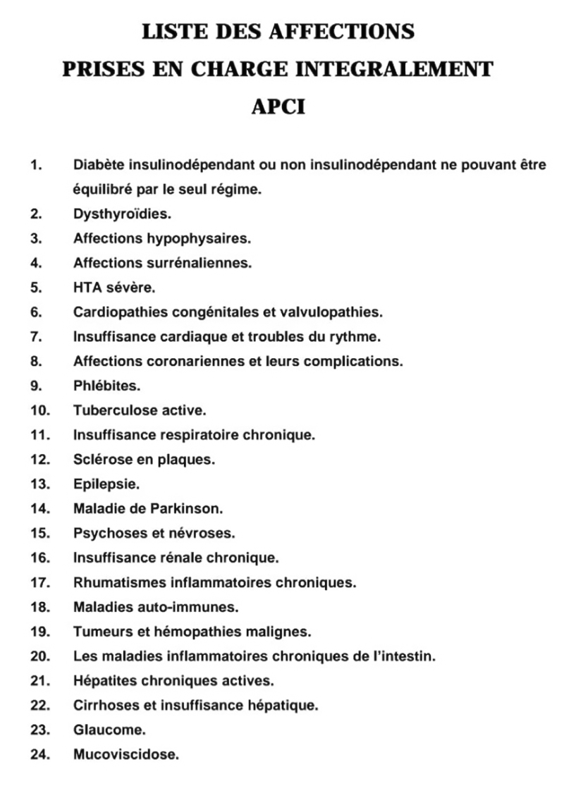 La liste des affections graves ou maladies chroniques (APCI) pour lesquelles la Caisse Nationale d’Assurance Maladie (CNAM) assure une prise en charge intégrale des soins, conformément aux dispositions réglementaires en vigueur, ouvre droit, après examen médical et constitution d’un dossier, à une couverture complète des frais relatifs au traitement, aux examens et aux médicaments prescrits.