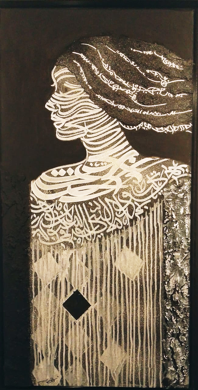 En ce qui concerne les matériaux, la curiosité de Zhour lui offre toutes les audaces. Elle grave et enlumine le bois qu’elle allie à la toile. Elle adapte le fer forgé à des panneaux peints en un paravent inattendu. Et elle crée des stèles auxquelles des calligraphies à la feuille d’or donnent de précieuses allures de cités abolies.